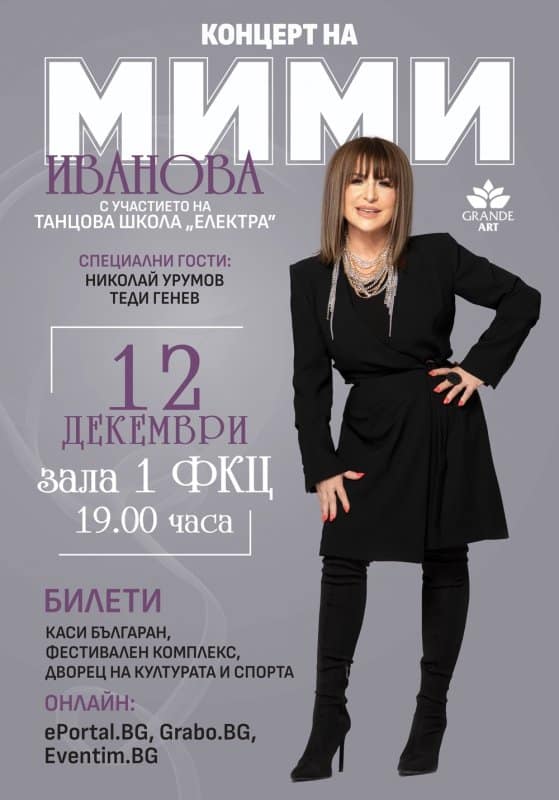 На 12 декември в един специален коледен концерт ярката и обичана легенда на българската естрада ще представи златните си хитове и песните от новия й репертоар. С нея на сцената ще има бенд, танцова формация и специални гости: Николай Урумов и Теди Генев.